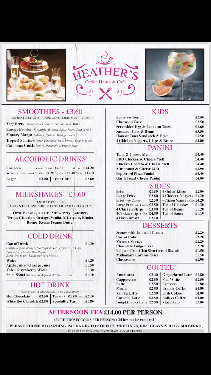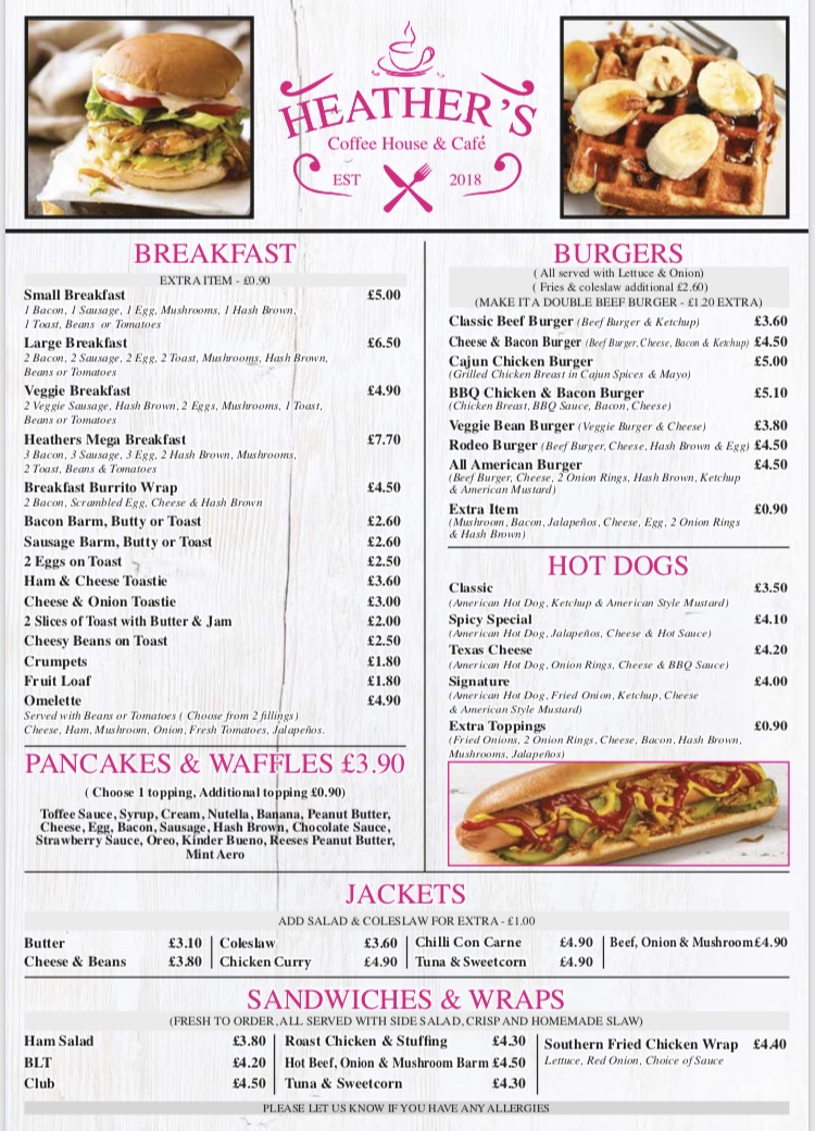 Welcome to Heathers Coffee House & Café, a charming spot nestled in Wigan that promises delightful culinary experiences. The menu is a vibrant showcase of flavors, starting with an array of jacket potatoes topped generously with options like cheese, beans, and chicken curry. For those craving something lighter, the café offers a selection of wraps and ciabattas such as ham salad and BBQ chicken & cheese melt, perfect for a quick bite.